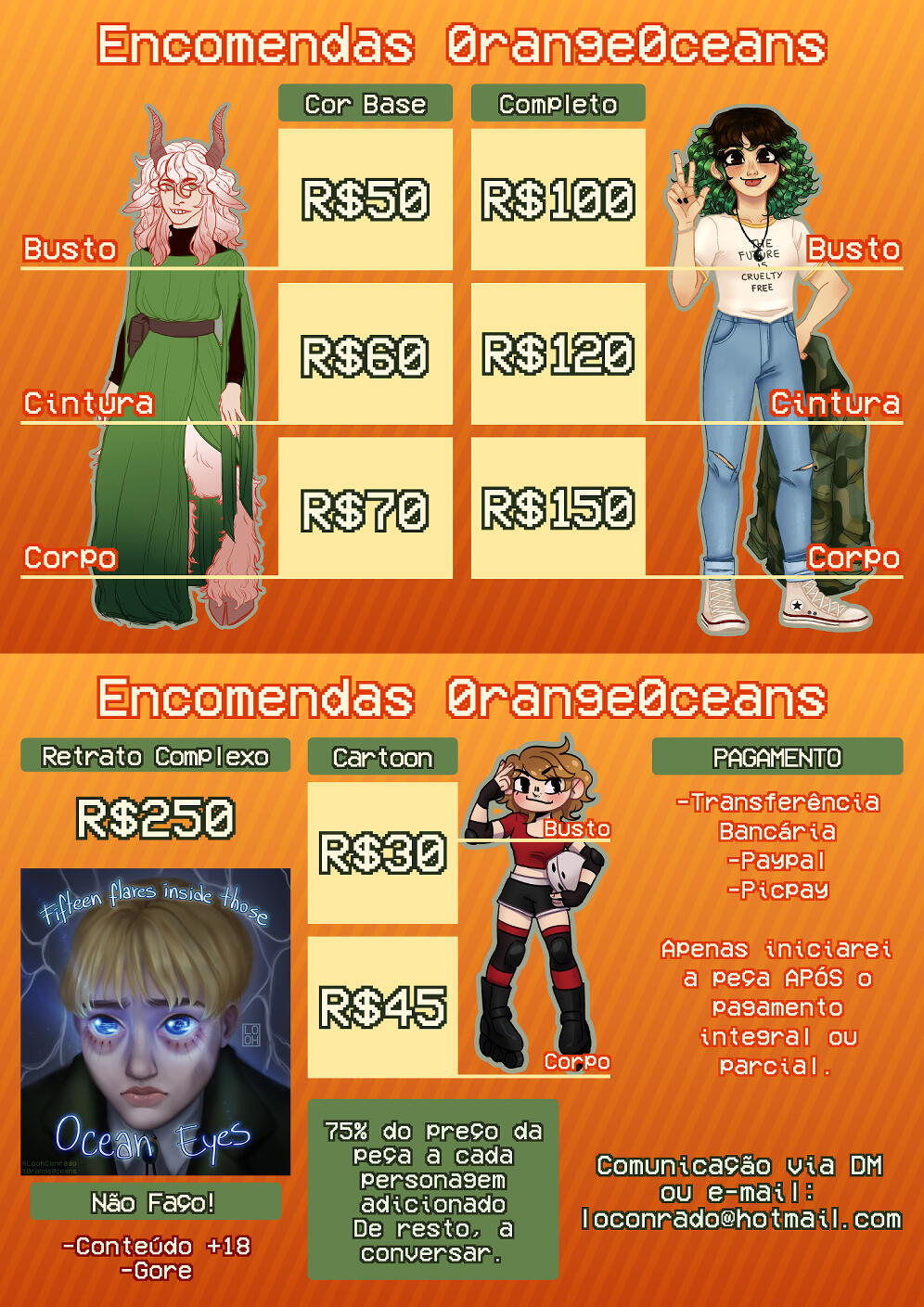 ▸Pagamento via Paypal e Nubank(Podendo negociar)▸Pagamento completo antes do inicio OU metade do pagamento antes do inicio, com a outra metade após o esboço ser aprovado▸A arte apenas será entregue após o pagamento integral